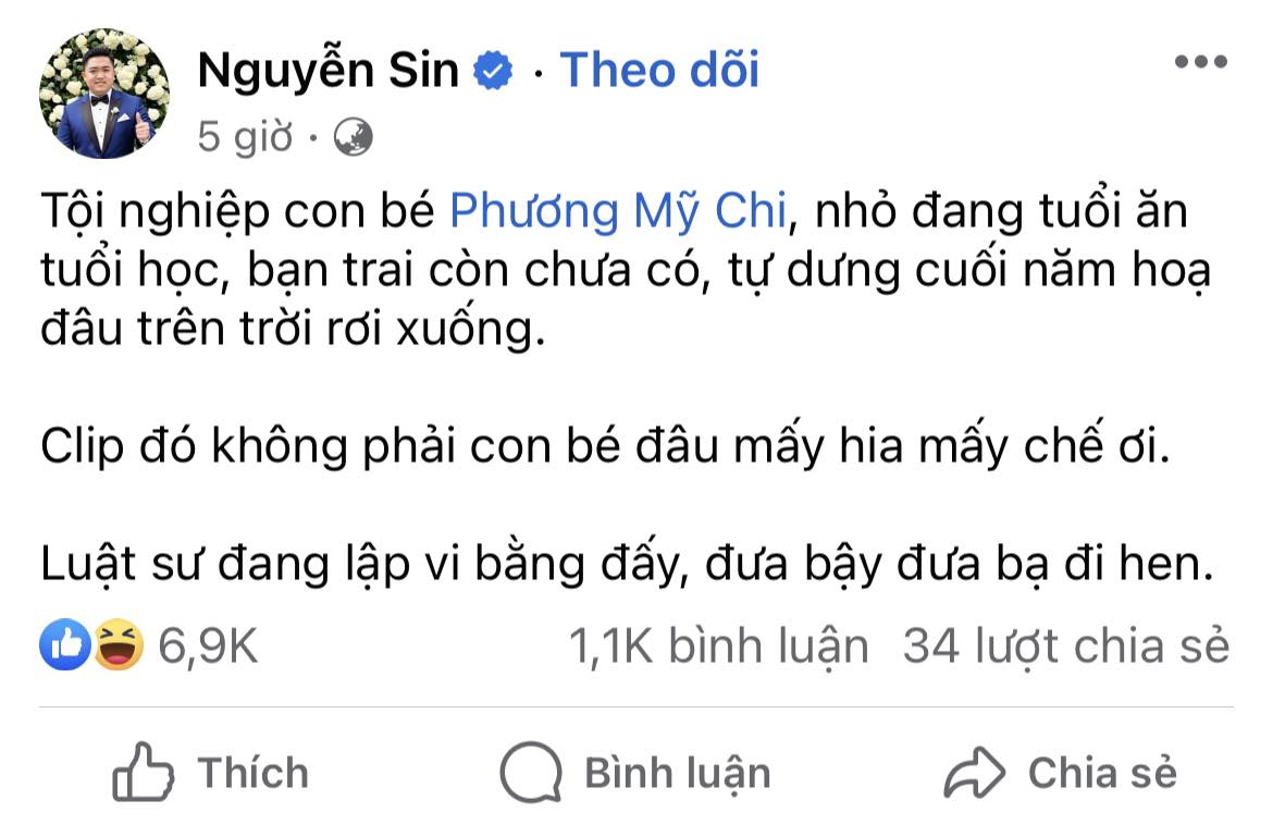 Đang trong lúc nước sôi lửa bỏng, Nguyễn Sin đã lên tiếng bênh vực, giải oan thay cho nữ ca sĩ “ Tội nghiệp con bé Phương Mỹ Chi, nhỏ đang tuổi ăn tuổi học, bạn trai còn chưa có, tự dưng cuối năm hoạ đâu trên trời rơi xuống.