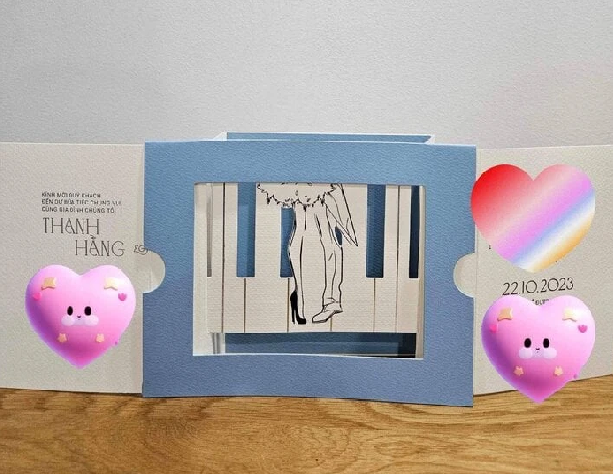 Thiệp cưới thanh lịch có tông màu xanh dương chủ đạo, lấy cảm hứng từ thời trang và âm nhạc với hình ảnh cặp đôi và phím đàn piano. Thiệp có chữ "H" và "M" (tên viết tắt của cô dâu, chú rể) đan xen.
