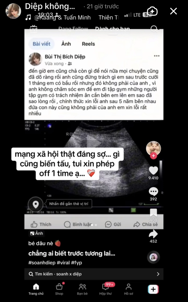 Theo đó, ngày 20/3, trong 1 clip được đăng tải, cư dân mạng phát hiện chỉ có Sơn Anh (Soanh) xuất hiện một mình trong bộ vest trắng giống clip cũ từ hồi làm đám cưới còn Diệp thì hoàn toàn biến mất. Bên cạnh đó, clip chỉ vỏn vẹn 2 chữ "Tạm biệt" cùng dấu mốc thời gian đ.ánh dấu quãng thời gian yêu nhau. Từ đó, cư dân mạng đồn đoán cặp đôi ẩn ý đã chia tay.