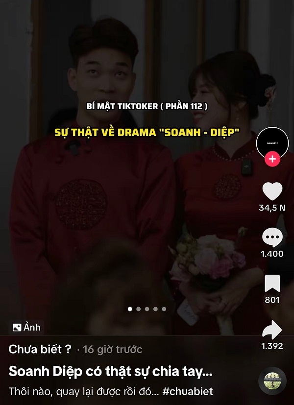 Cặp đôi tiktoker Soanh và Diệp từng chiếm trọn trái tim của người hâm mộ bởi tính cách vui vẻ, chân thành. Tưởng chừng sau đám cưới cặp đôi sẽ cùng nắm tay nhau xây dựng hạnh phúc nhưng nào ngờ họ lại chia tay nhanh chóng.