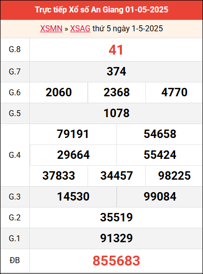 Mời các bạn xem lại bảng kết quả kỳ trước với giải đặc biệt, giải tám, lô tô 2 số để có thể đưa ra nhận định dự đoán AG ngày 8 tháng 5 năm 2025 chuẩn xác nhất.