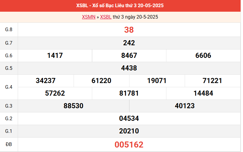 Kết quả xổ số Bạc Liêu ngày 20/5/2025