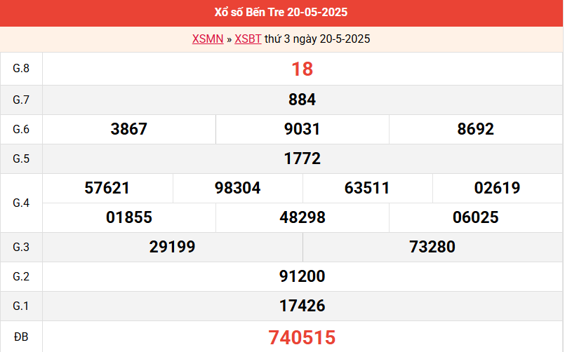 Kết quả xổ số Bến Tre ngày 20/5/2025
