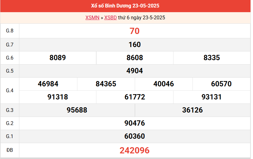 Kết quả xổ số Bình Dương ngày 23/5/2025