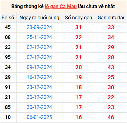 Bảng thống kê lô gan Cà Mau lâu về nhất 5/5/2025