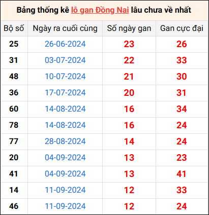 Bảng thống kê lô gan Đồng Nai lâu về nhất 11/12/2024