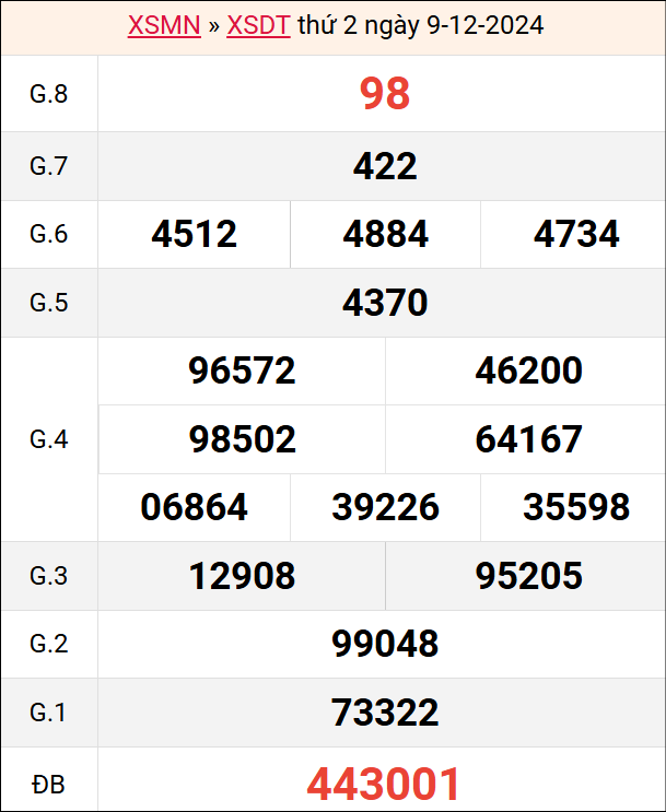 Mời các bạn xem lại bảng kết quả kỳ trước với giải đặc biệt, giải tám, lô tô 2 số để có thể đưa ra nhận định dự đoán DT ngày 16 tháng 12 năm 2024 chuẩn xác nhất.