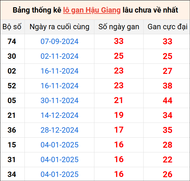 Bảng thống kê lô gan Hậu Giang lâu về nhất 3/5/2025