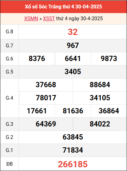 Bảng kết quả Sóc Trăng ngày 30/4/2025 tuần trước