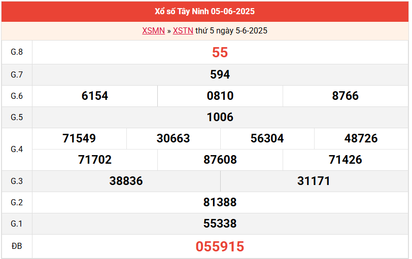 Kết quả xổ số Tây Ninh ngày 5/6/2025