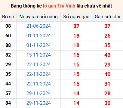 Bảng thống kê lô gan Trà Vinh lâu về nhất 14/3/2025
