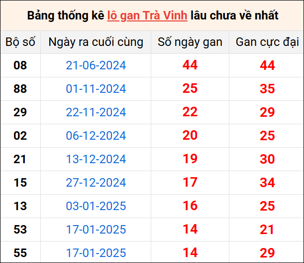 Bảng thống kê lô gan Trà Vinh lâu về nhất 2/5/2025