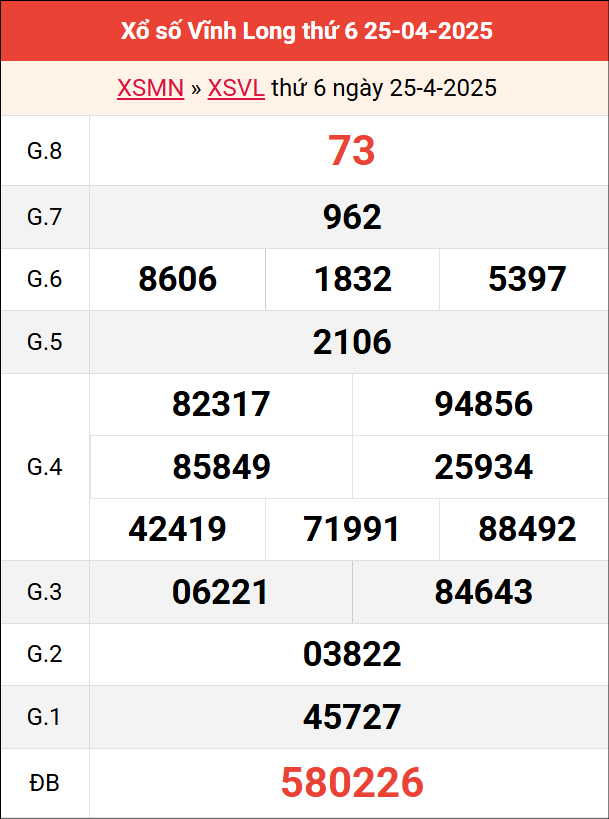 Mời các bạn xem lại bảng kết quả kỳ trước với giải đặc biệt, giải tám, lô tô 2 số để có thể đưa ra nhận định dự đoán VL ngày 2 tháng 5 năm 2025 chuẩn xác nhất.
