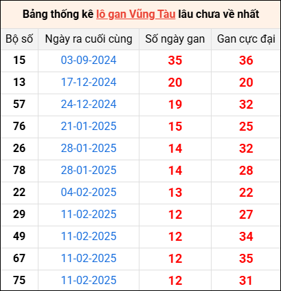 Bảng thống kê lô gan Vũng Tàu lâu về nhất 13/5/2025