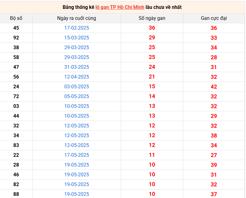 Bảng thống kê lô gan Hồ Chí Minh lâu về nhất 28/6/2025