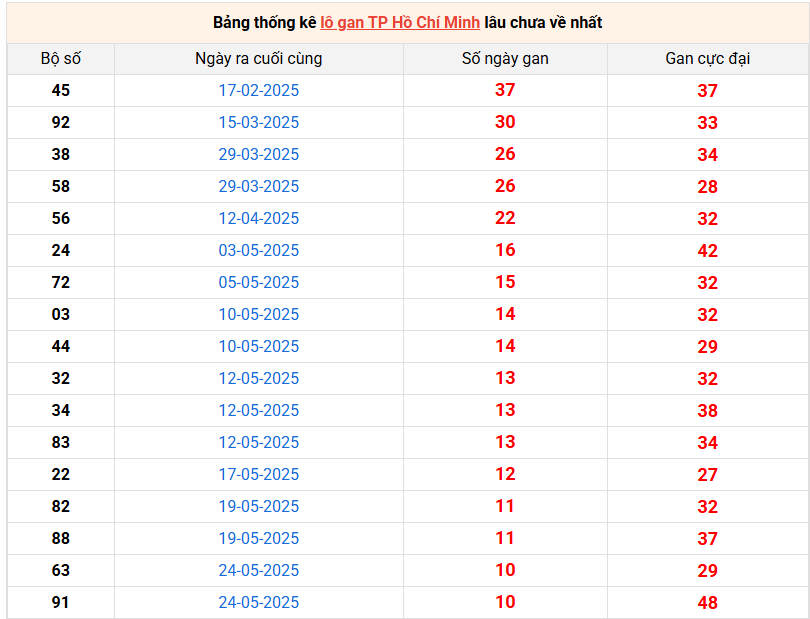Bảng thống kê lô gan XSTP lâu về nhất 30/6/2025
