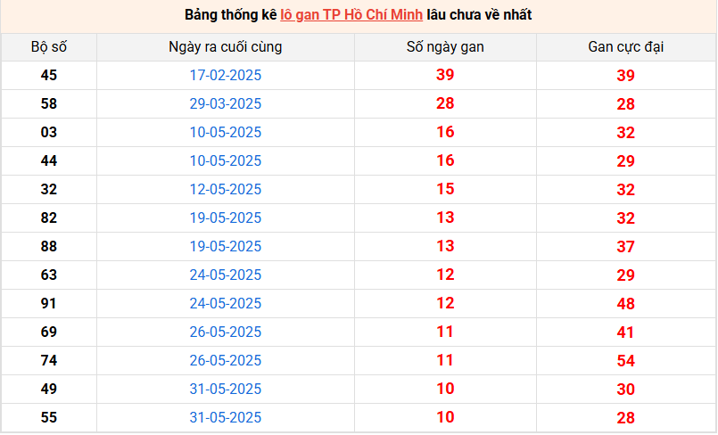 Bảng thống kê lô gan XSTP lâu về nhất 7/7/2025