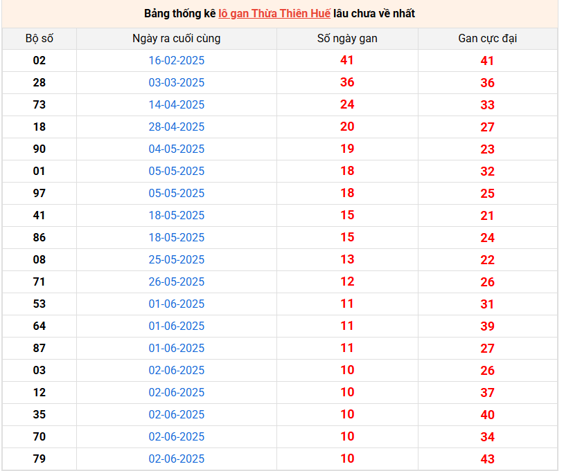 Bảng thống kê lô gan Huế lâu về nhất 14/7/2025