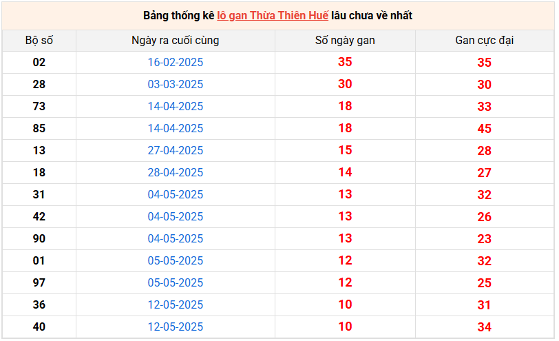 Bảng thống kê lô gan Huế lâu về nhất 22/6/2025
