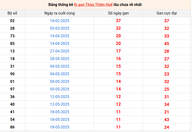 Bảng thống kê lô gan Huế lâu về nhất 29/6/2025