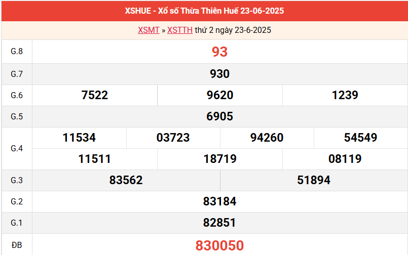 Bảng kết quả Huế ngày 23/6/2025 tuần trước