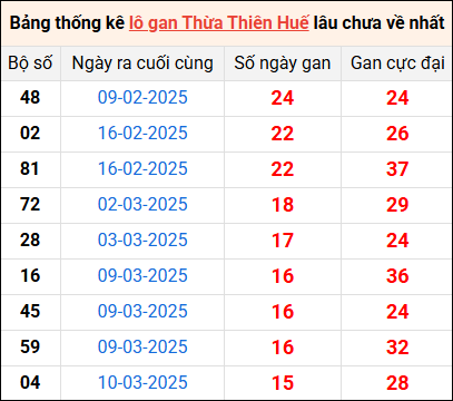Bảng thống kê lô gan Huế lâu về nhất 5/5/2025