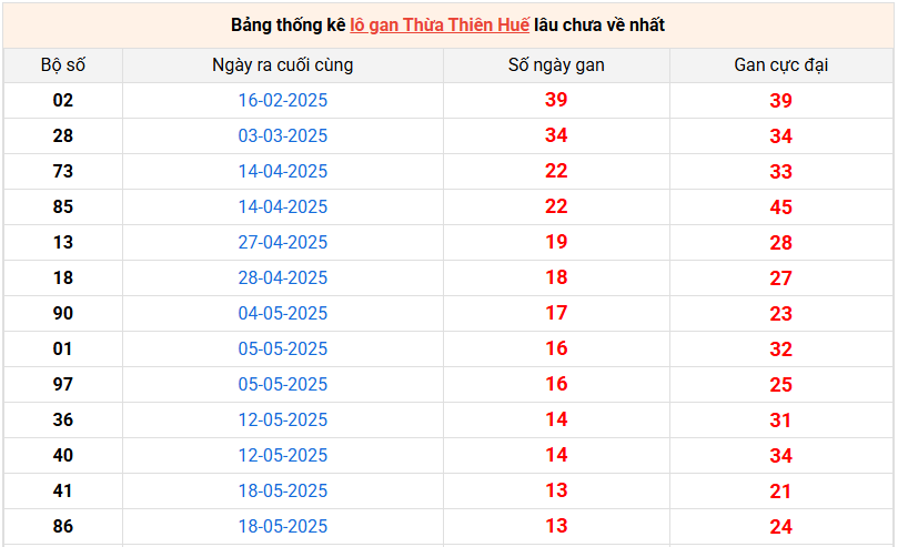 Bảng thống kê lô gan Huế lâu về nhất 06/7/2025