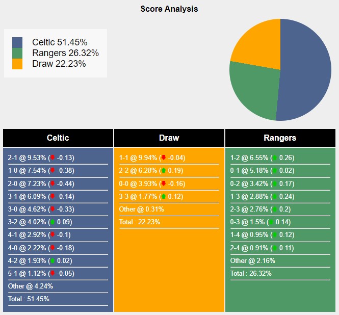 Với các tỷ số có khả năng xảy ra, đội chủ nhà Celtic thắng lợi 2-1 đạt 9,53%. Đội chủ nhà và đội khách hoà 1-1 đạt 9,94%. Đội khách Rangers có 6,55% đánh bại Celtic 2-1.