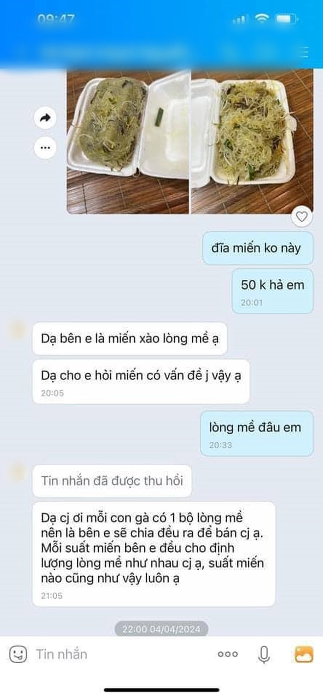 Chẳng có gì đáng nói nếu như 2 phần miến, mỗi phần có giá 49 nghìn kia lại chẳng có tí topping nào. Khi nhắn tin hỏi lại chủ quán, phía quán cho biết đây mà miến xào lòng mề. Lời qua tiếng lại thì bạn khách nhận được câu trả lời rằng: "Dạ chị ơi mỗi con gà có 1 bộ lòng mề nên là bên em sẽ chia đều ra để bán chị ạ. Mỗi suất miến bên em đều cho định lượng lòng mề như nhau chị ạ, suất miến nào cũng như vậy luôn ạ".