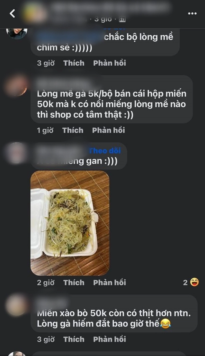 Bên cạnh đó, một số ý kiến từ cư dân mạng cũng không quên nhấn mạnh tới vấn đề về chất lượng đóng gói của suất ăn, với hình ảnh sản phẩm sau khi đóng gói trông rất không bắt mắt, khiến cho khách hàng có phản hồi tiêu cực là điều hoàn toàn dễ hiểu. Họ bày tỏ sự không hài lòng khi mua phần miến xào lòng mề nhưng lại chỉ nhận được phần miến trơ trọi, khách hàng cảm thấy mình bị thiệt thòi trong giao dịch này.