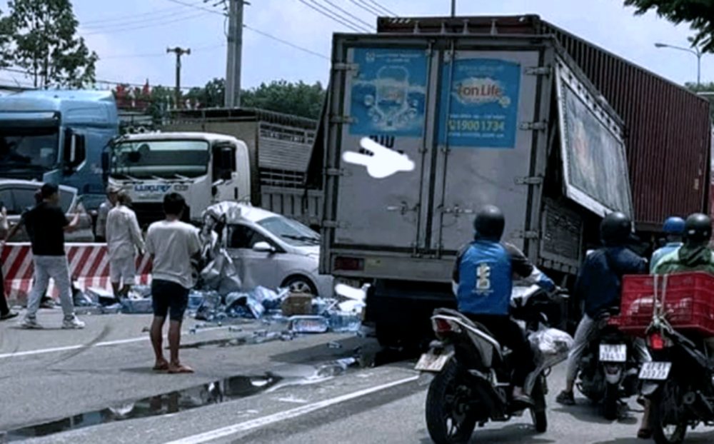 Tại hiện trường, 3 phương tiện dính chùm nhau trên Quốc lộ 13. Đầu xe tải chở nước bẹp dúm dính chặt vào xe container, tài xế mắc kẹt bên trong. Ngay bên cạnh là xe 4 chỗ (xe tập lái) bị bẹp dúm phần đuôi.