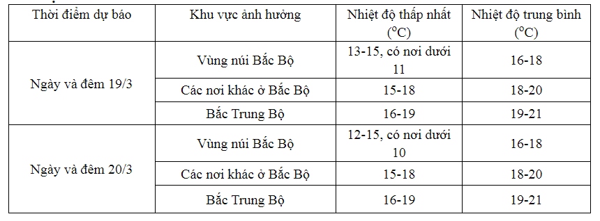 Từ ngày 19/3, ở khu vực Bắc Bộ và Bắc Trung Bộ trời chuyển rét. Trong đợt không khí lạnh này nhiệt độ thấp nhất ở Bắc Bộ phổ biến từ 15-18 độ, khu vực vùng núi từ 12-15 độ, vùng núi cao có nơi dưới 10 độ; Bắc Trung Bộ phổ biến từ 16-19 độ.