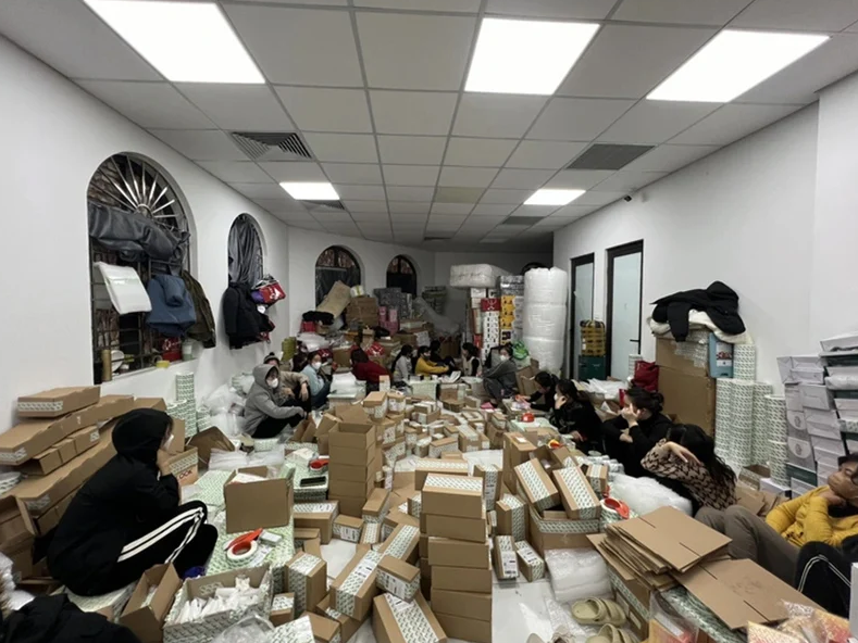 Kho hàng là một căn biệt thự 5 tầng, diện tích mỗi tầng rộng khoảng 100m2. Mọi ngóc ngách trong biệt thự đều được tận dụng để chứa hàng hóa. Trong kho hàng có chứa nhiều hàng hóa như mỹ phẩm, thực phẩm chức năng... có nguồn gốc từ nước ngoài. Ở thời điểm điểm kiểm tra, tại kho hàng có khoảng 50 nhân viên đang thực hiện công đoạn đóng gói sản phẩm.