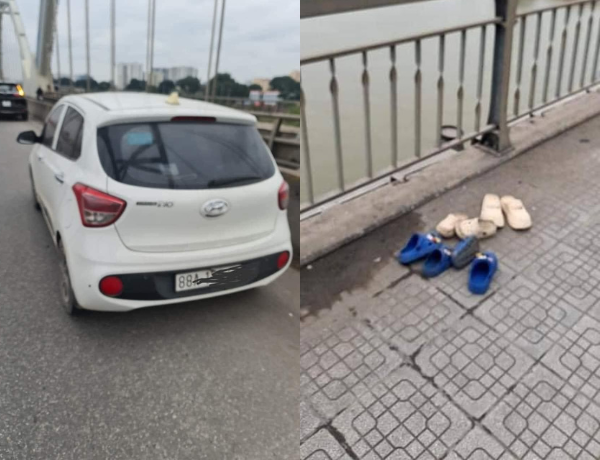 Ô tô và các đôi dép được phát hiện trên cầu Đông Trù. Ảnh: Facebook