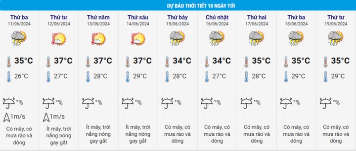 Bắc Bộ và Thanh Hóa, từ chiều 10/6 mưa rào và dông rải rác, cục bộ có mưa to. Từ ngày 11/6 có nắng nóng cục bộ.