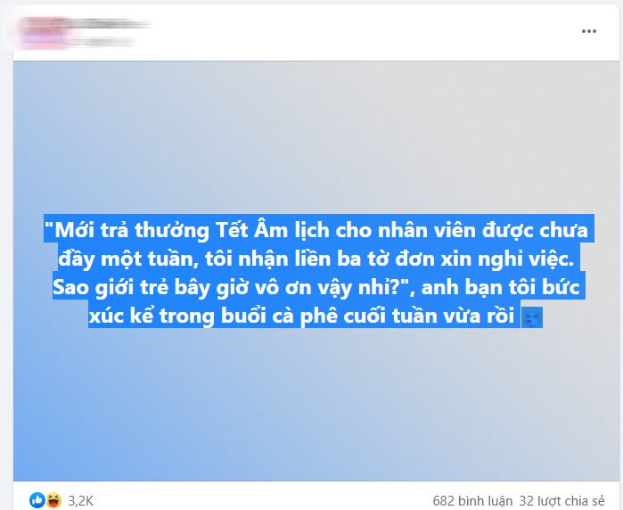 'Mới trả thưởng Tết Âm lịch cho nhân viên được chưa đầy một tuần, tôi nhận liền ba tờ đơn xin nghỉ việc. Sao giới trẻ bây giờ vô ơn vậy nhỉ?', anh bạn tôi bức xúc kể trong buổi cà phê cuối tuần vừa rồi' – chi tiết bài đăng gây tranh cãi.