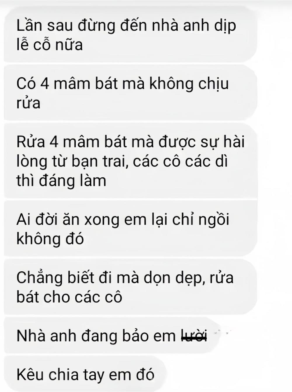 Cô gái kể, suốt quá trình từ lúc đến cho tới lúc về cô không được ngơi nghỉ lúc nào. Cô có cầu cứu bạn trai nhưng anh mặc kệ. Ăn xong có vài người về luôn vì nhà xa, bố mẹ anh ra cổng tiễn. Còn lại người thì ngồi uống trà, người thì gọt hoa quả, mình cô ngồi giữa 5 mâm bát. Thậm chí 1 chị còn dặn cô “Rửa nhanh lên ăn hoa quả em nhé”.
