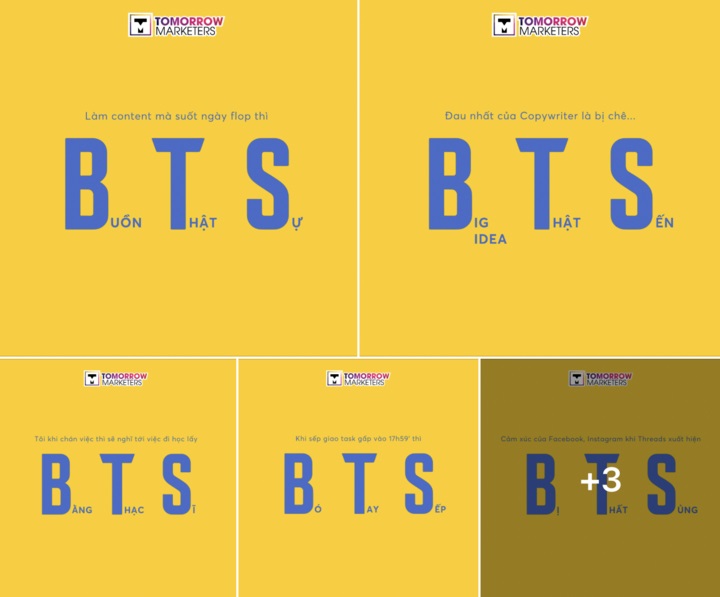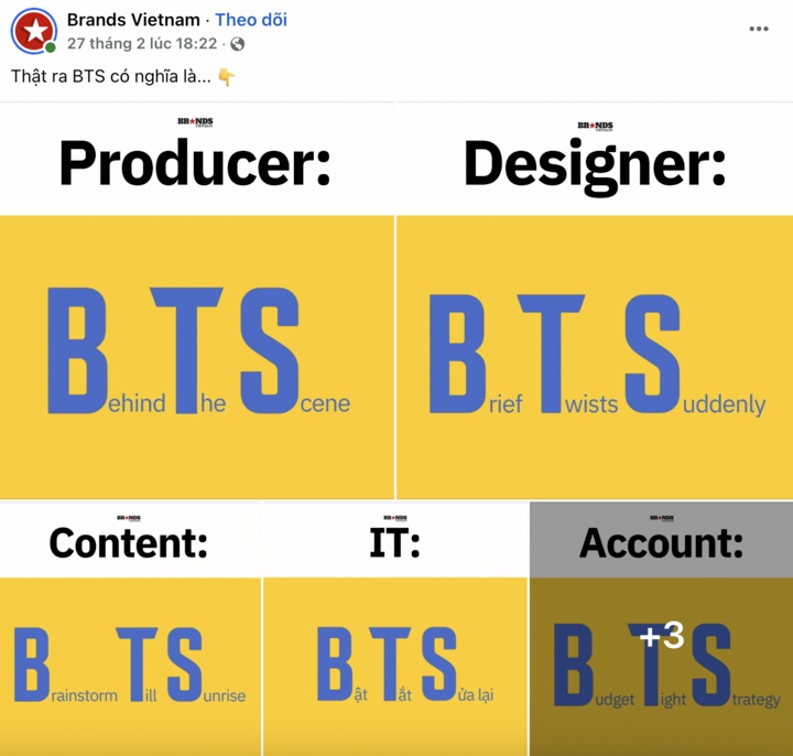 Không chỉ dừng lại ở những fanpage thương hiệu, hội nhóm mà mọi ngành nghề, lĩnh vực khác nhau hay các cá nhân cũng dễ dàng tham gia vào trào lưu này bằng cách tạo ra những cụm từ hoặc thông điệp riêng với ba chữ cái BTS. Các bạn học sinh sinh viên cũng nhanh chóng sáng tạo ra những câu khích lệ tinh thần trong kỳ thi sắp tới theo trend BTS.