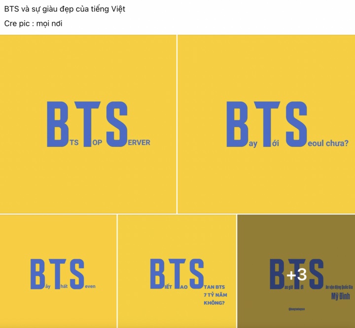 Kết quả là hình ảnh nền vàng chữ xanh nhanh chóng phủ sóng rộng rãi trên các mạng xã hội tại Việt Nam. Sự sáng tạo của cộng đồng mạng đã cho ra đời vô số nội dung đa dạng và ấn tượng. Tuy nhìn qua có vẻ đơn giản và rất "BTS", nhưng khi zoom cận cảnh, người xem mới khám phá ra những thông điệp ý nghĩa được "giấu" dưới ba chữ cái nổi bật ấy.