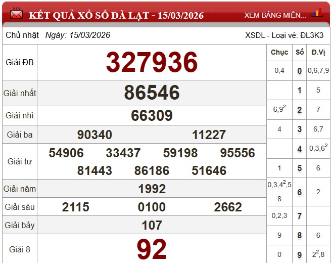 Kết quả xổ số Đà Lạt ngày 15/3/2026