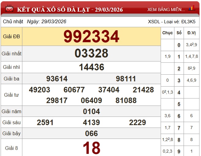 Kết quả xổ số Đà Lạt ngày 29/3/2026