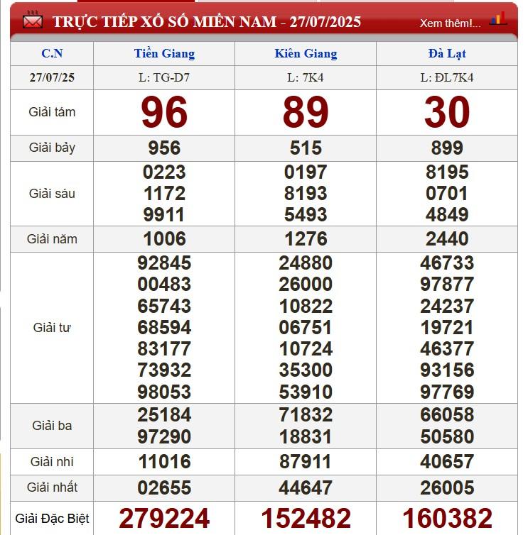 - Chủ nhật hàng tuần xổ số miền Nam được mở thưởng tại Kiên Giang, Tiền Giang, Đà Lạt