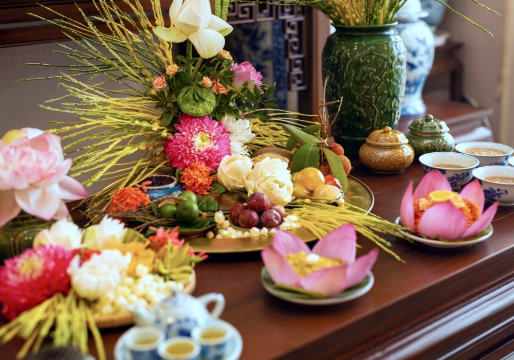 Hôm nay là ngày Đoan ngọ, chúng con sửa sang hương đăng, sắm sanh lễ vật, hoa, trà, quả dâng lên trước án.