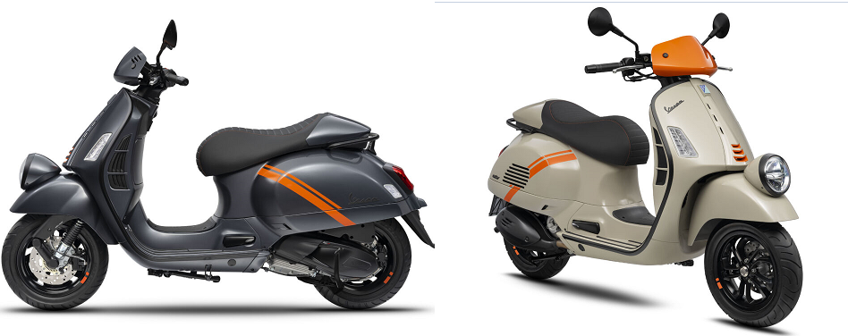 Vespa GTV 2023 phối màu hài hòa Be bóng Sabbia với Xám bóng Titanio cùng bộ tem sọc cam chéo bên hông. Diện mạo tổng thể nổi bật hơn nữa với các chi tiết sơn đen nhám đặc trưng chạy dọc khung thân xe, viền đèn pha thấp đến cụm đèn hậu, tay dắt, gác chân, ốp ống xả, gương chiếu hậu, khung đỡ và khung bảng đồng hồ.
