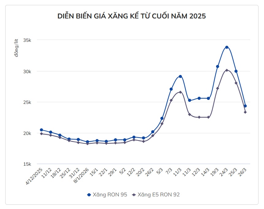 Đặc biệt, đây cũng là lần giảm sâu thứ 2 liên tiếp của giá xăng RON 95 chỉ trong vòng 2 ngày. Tại kỳ điều hành chiều ngày 25/3 trước đó, giá mặt hàng này cũng đã giảm 3.890 đồng, xuống 29.950 đồng một lít. Tương tự, xăng E5 RON 92 hạ 2.040 đồng, có giá mới 28.070 đồng. Tổng cộng mức giảm sau 2 kỳ điều hành liên tiếp của xăng RON 95 lên tới 9.510 đồng/lít, tương đương mức giảm ròng gần 30%.