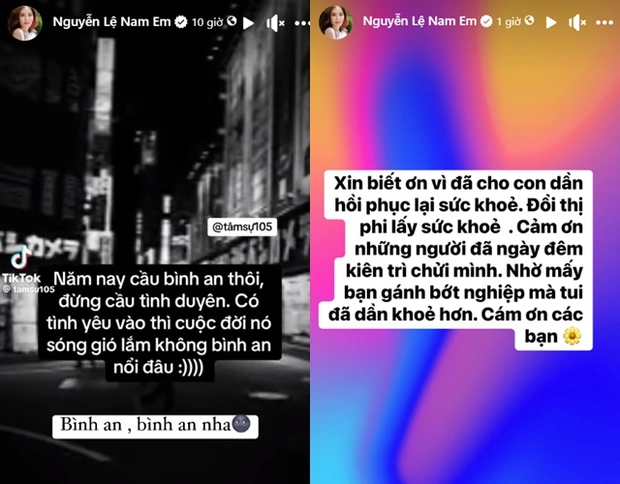 Bên cạnh phát ngôn về tình cảm, Nam Em cũng tiết lộ thêm về tình trạng sức khỏe hiện tại của mình. Cô cho biết mình đã hồi phục dần nhưng không quên "đá đểu" antifan công kích mình trong thời gian qua.