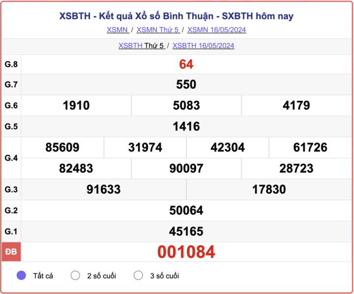 - Kết quả XSBTH ngày 16/5/2024