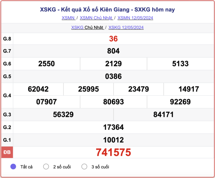 XSKG Chủ nhật, kết quả xổ số Kiên Giang ngày 12/5/2024