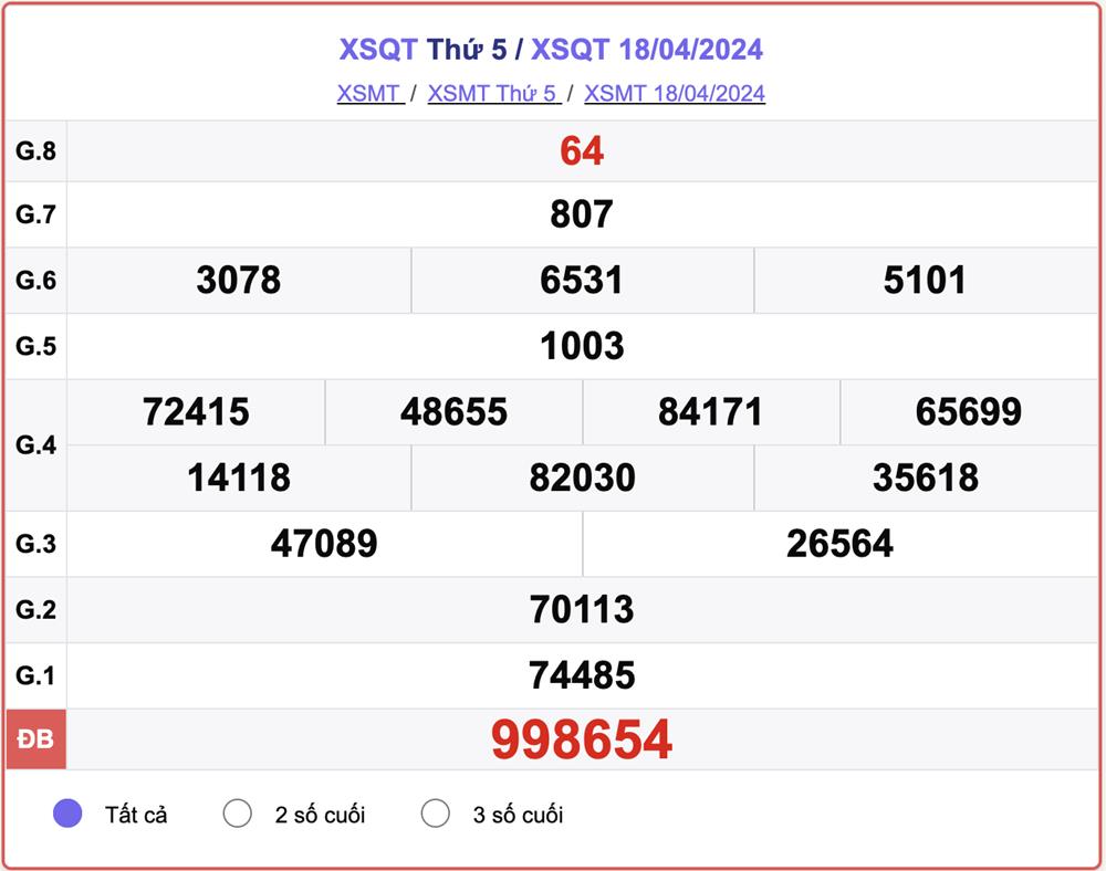 XSQT thứ Năm, kết quả xổ số Quảng Trị ngày 18/4/2024