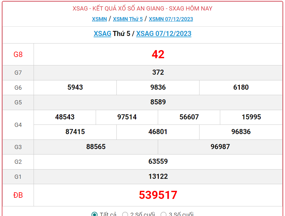 XSAG thứ 5, kết quả xổ số An Giang hôm nay 7/12/2023